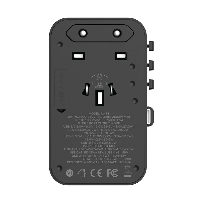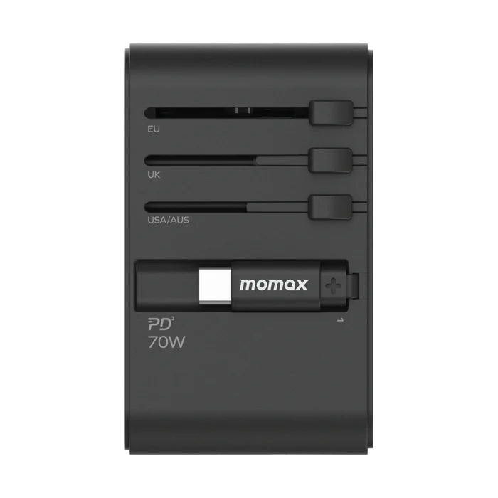 Travel light with the 70W power solution from Momax and leave your other charges at home! Using GaN technology, the 1-World 3-Port GaN 70 Travel Charger dynamically optimizes power delivery to provide the fastest and safest charging for your MacBook, phones, laptops, and more.
