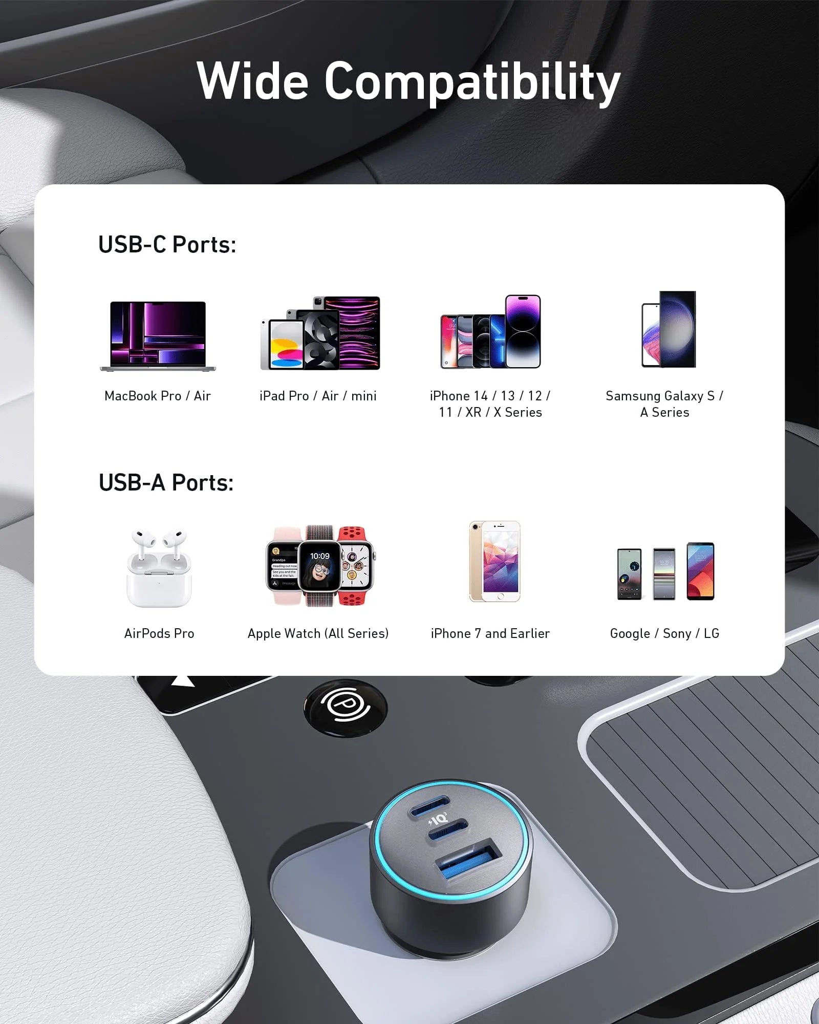 The small and compact car charger, measuring just 2.3 × 1.2 × 1.2 inches, makes it the perfect travel companion for non-stop power on the road.