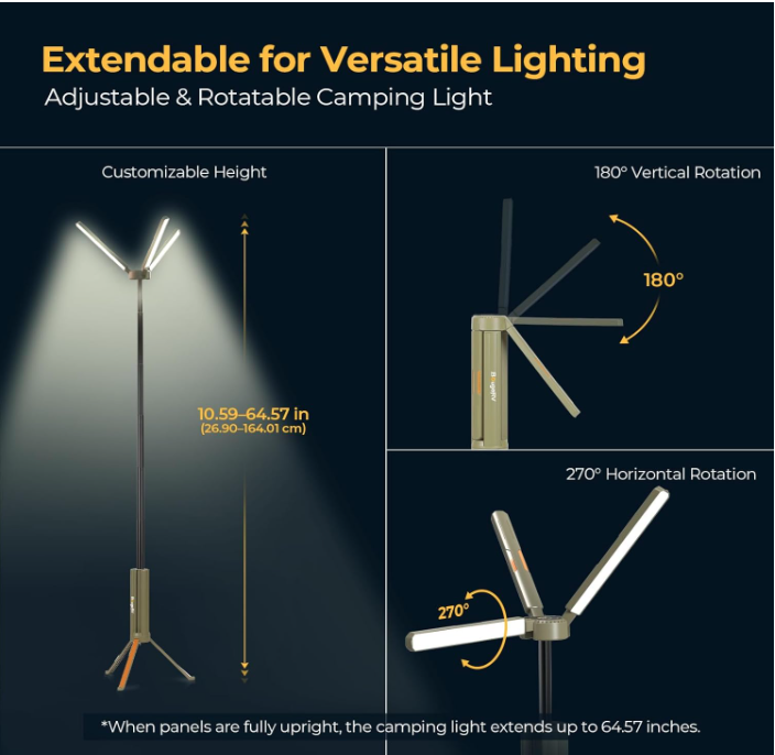 - Telescopic Design: This camping lantern extends from 10.6" to 64.57", letting you easily adjust the height to light up hard-to-reach areas and meet different outdoor lighting needs