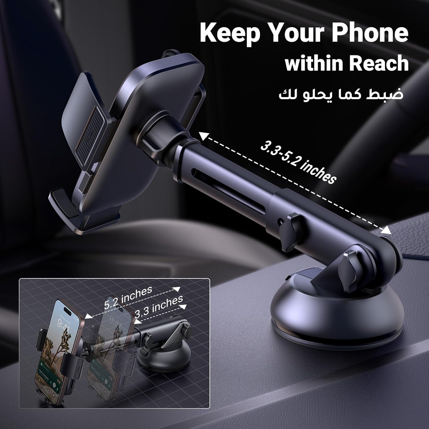 - 【Unrivaled Suction & Heat-Proof Stability】Our cutting-edge car phone holder is engineered to conquer the UAE’s extreme summer heat. Boasting advanced nano layers for peerless durability, and a rugged double-locked suction cup fortified with heat-resistant gel, this premium car accessory secures your device firmly in place, defying even the highest temperatures.