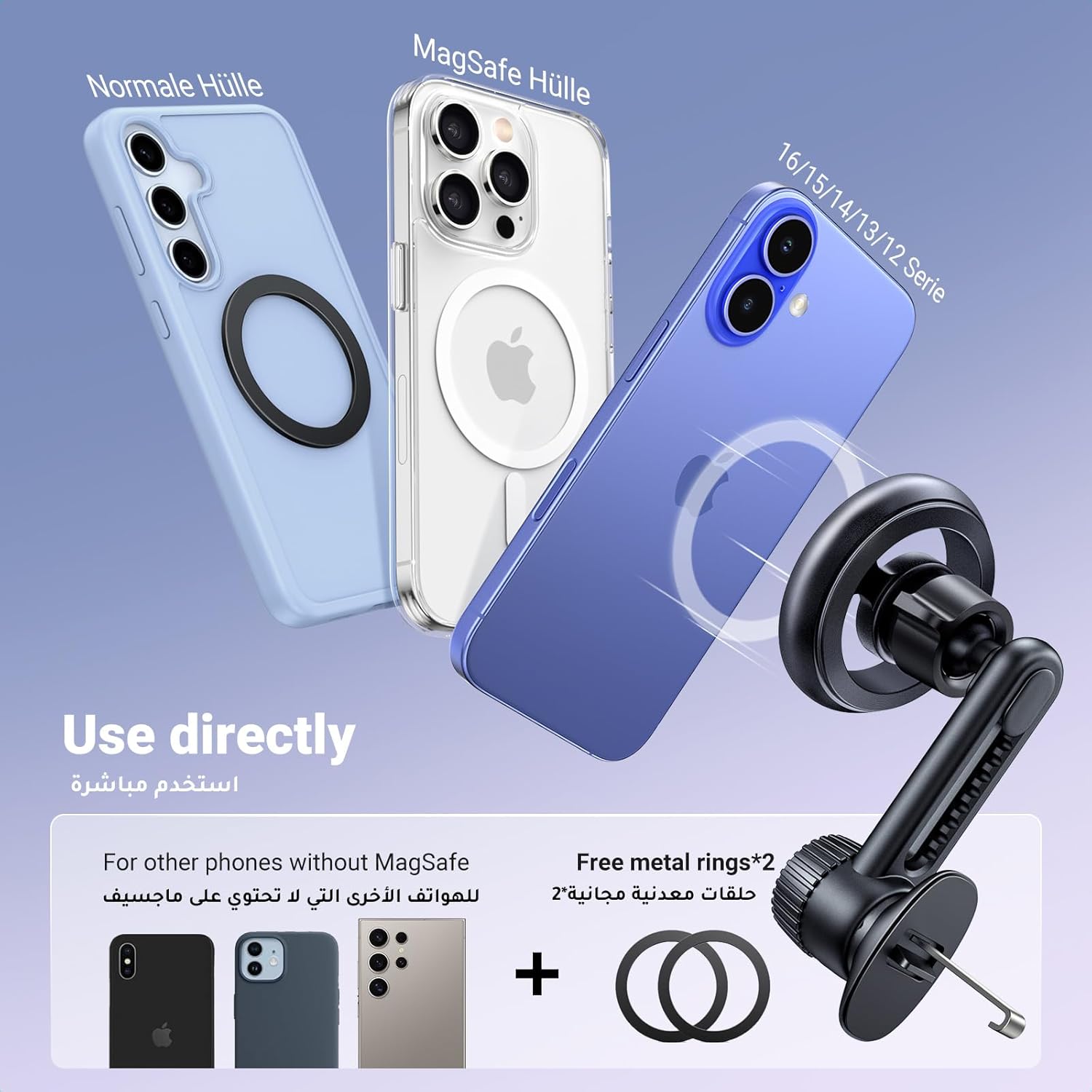 - 【Universal Compatibility】Our phone holder car is crafted to effortlessly attach to iPhone 12/13/14/15/16 Pro Max and all MagSafe cases. (Tip: For compatibility with other phone models, such as the Galaxy S25/S24/S23/S22 series, and non-MagSafe cases, the included metal ring is essential.)