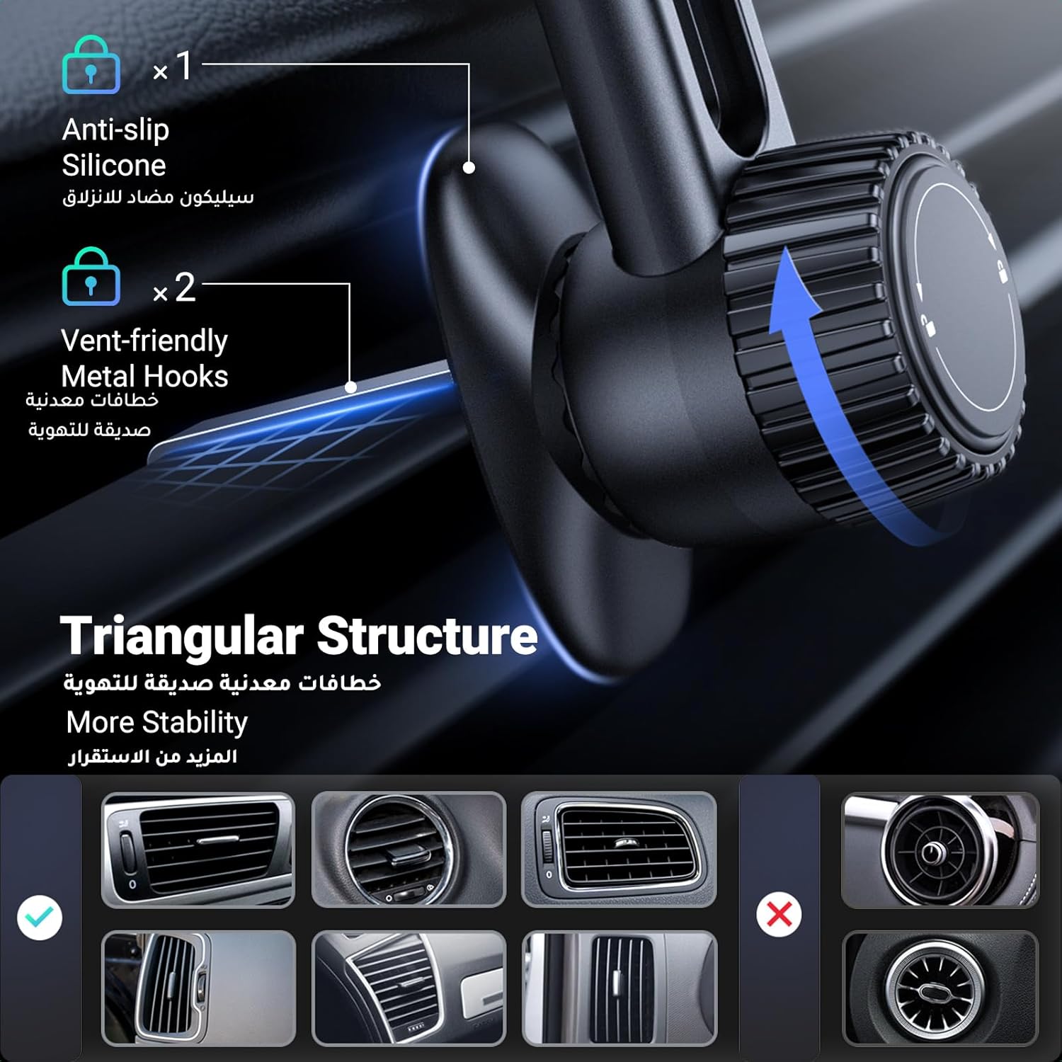 - 【Unshakable Stability】Outfitted with a rugged metal hook and a cutting-edge double-lock system, our mobile holder for car delivers unwavering grip on your air vent, remaining immovable through the roughest rides, tightest turns, or unexpected braking. Count on its stability—100% shake-proof and reliable.